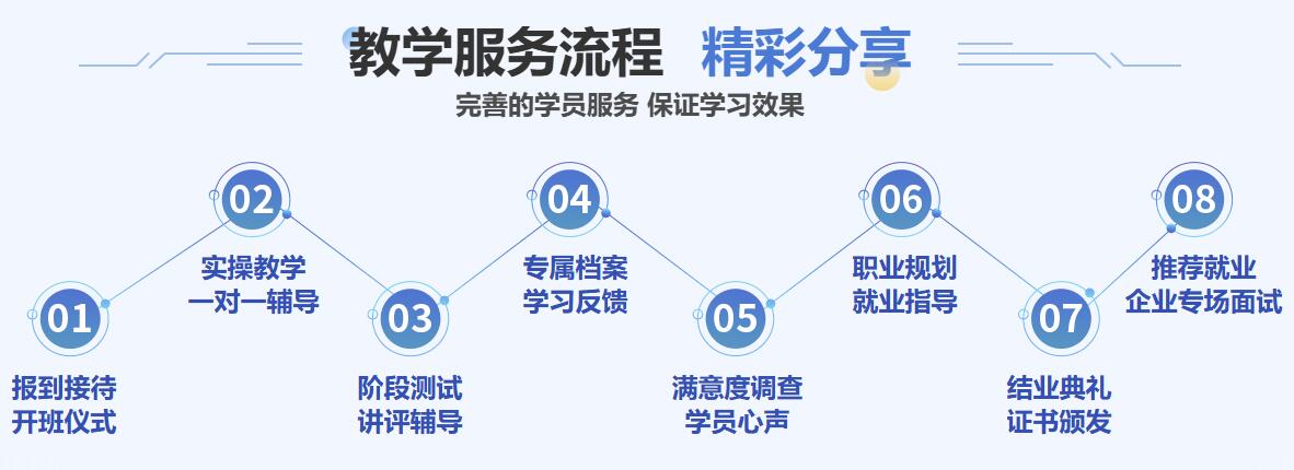 1、就业通关指导 2、3v1师资专属服务群 3、线上智能答疑平台 4、班主任全程服务 5、一人一机,手把手教学 6、项目实战案例教学 7、档案式管理,过程考核 8、包教包会,一期不会, 9、精品配套讲义 10、技术咨询指导服务 |
